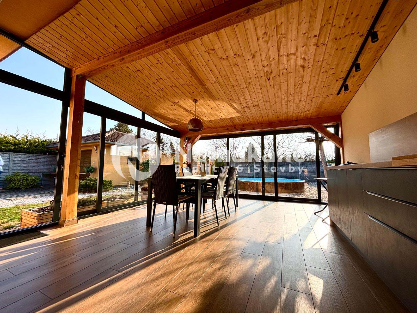 Hlavnou doménou domu je otvorená denná časť s krbom, ktorá prirodzene prepája interiér so zimnou záhradou. Tá vytvára ideálny priestor na celoročné posedenie s rodinou či priateľmi. Je plne funkčná, disponuje vlastnou kuchynskou linkou so zabudovanými spotrebičmi a jej presklená časť je odsúvateľná, čo umožňuje dokonalé prepojenie so záhradou. Strecha zimnej záhrady bola nanovo realizovaná, je kvalitne zaizolovaná a interiér je obložený tatranským profilom, čo dodáva priestoru útulnú atmosféru.