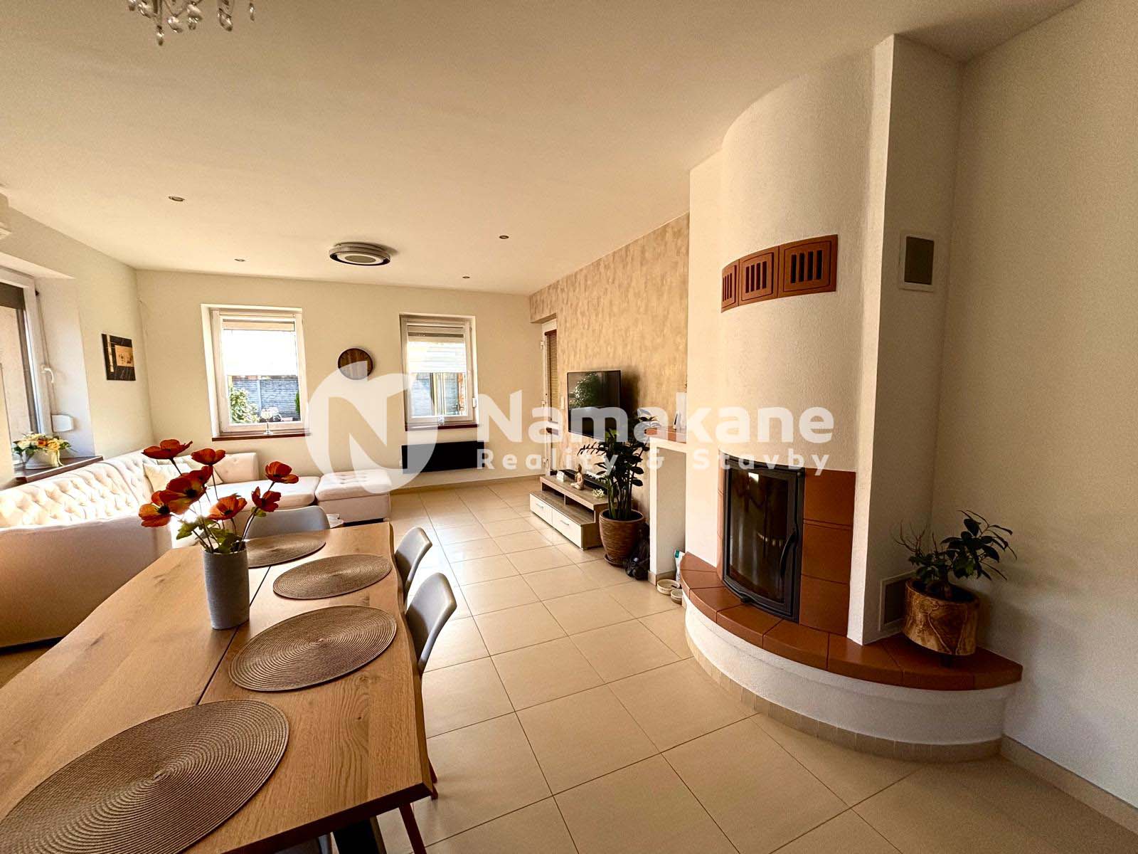 • priestranná obývacia izba s krbom prepojená s jedálňou a kuchyňou